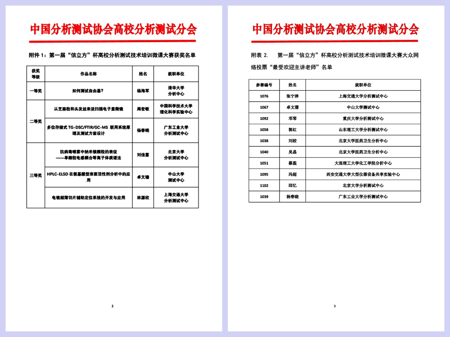 第一届“信立方杯”高校分析测试技术培训微课大赛由中国分析测试协会高校分析测试分会联合仪器信息网共同举办,旨在贯彻教育部启动的“教育数字化战略行动”,提升高校Betvictor中文版分析测试技术培训技能,有效支撑高校人才培训发展的需求。高校分析测试分会学术奖励评审委员会的专家学者从专业性、创新性、视频内容、视频呈现等四个方面,对申报的培训课程视频进行评审,经过形式审查、函评和会议评审,评选出一等奖1名、二等奖2名、 三等奖3名;同时,举行大众网络投票活动,评选出“最受欢迎主讲老师”10名;大赛获奖名单见下图。