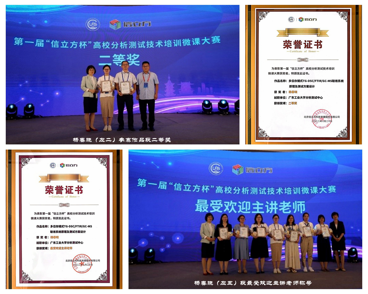 会议期间隆重举办了第一届“信立方杯”高校分析测试技术培训微课大赛颁奖典礼,中心杨春晓老师的参赛作品《多位存储式TG-DSC/FTIR/GC-MS联用系统原理及测试方案设计》荣获大赛“二等奖”,杨春晓老师获“最受欢迎主讲老师”称号。