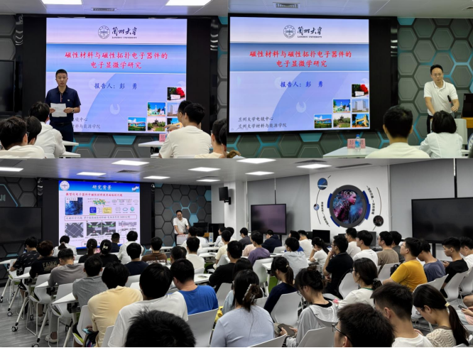 讲座中,彭教授提出低维磁性结构如磁性隧道结或磁性自旋阀作为磁电子学器件和磁性传感器的核心功能单元在进一步微型化过程中碰到了停滞不前的困境,其中一个根本的问题在于人们对纳米尺度和亚纳米尺度下低维磁性结构单体和器件实际发生的磁化动力学中的关键过程缺乏直观、直接的了解。为了解决这些磁学问题,他们课题组提出并制造了扫描电镜和透射电镜两类原位纳米单体磁输运测量仪器,并用于了磁性材料和器件的磁化动力学研究。彭教授还深入浅出地介绍了他们课题组过去几年利用电子显微学方法在低维磁性材料微观原子结构与磁学性能之间的构效关系、磁性材料与磁性拓扑电子器件电镜原位磁化动力学等方面的一些研究进展。现场师生认真聆听,积极参与,还结合自身在研究、测试中的问题与彭教授展开了深入的交流与互动。
