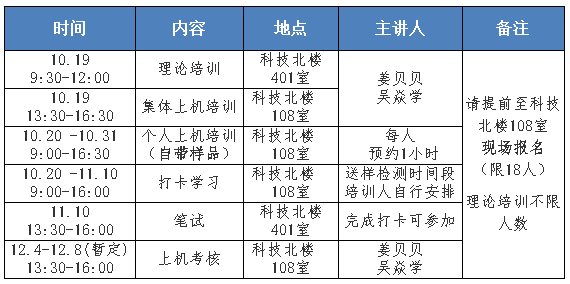 3.个人上机培训,由培训人自带样品(请培训同学提前准备自己的非磁性样品,金属或陶瓷样品请提前咨询制样),并预约机时(10月19日开放自主预约),个人单独进行培训,拍摄自己的样品,每人每次1小时,往期培训的同学也可申请机时上机练习操作(请提前报名)。