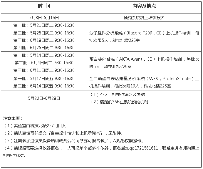 为更好地满足广大师生的测试需求,Betvictor中文版生物大分子分析室将于2024年5月8日-6月28日分批次,在科技北楼227室举办分子互作分析系统(Biacore T200,GE)、蛋白纯化系统(AKTA Avant,GE)、全自动蛋白表达定量分析系统(WES,ProteinSimple)的上机操作培训。现将有关事宜通知如下: