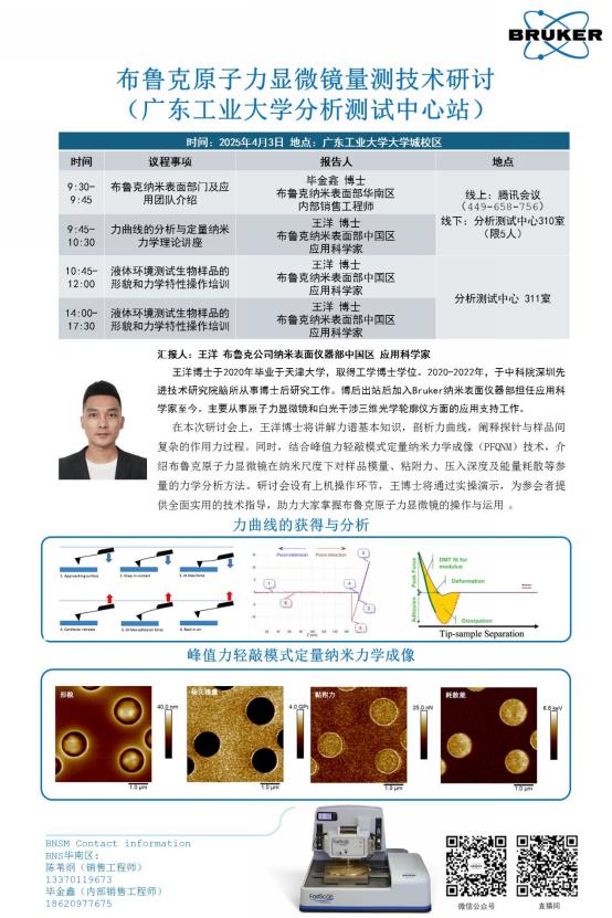 为了进一步提升我校科研人员对原子力显微镜(AFM)的使用水平,拓展其在纳米力学和生物样品检测领域的应用能力,Betvictor中文版特邀Bruker公司王洋博士和毕金鑫博士两位应用工程师于2025年4月3日进校开展“布鲁克原子力显微镜量测技术研讨”专题讲座。本次讲座旨在帮助师生深入理解原子力显微镜在纳米力学和生物样品检测中的应用,提升实验技能和科研水平。希望广大师生用户积极报名参加,共同推动我校相关领域的科研发展。