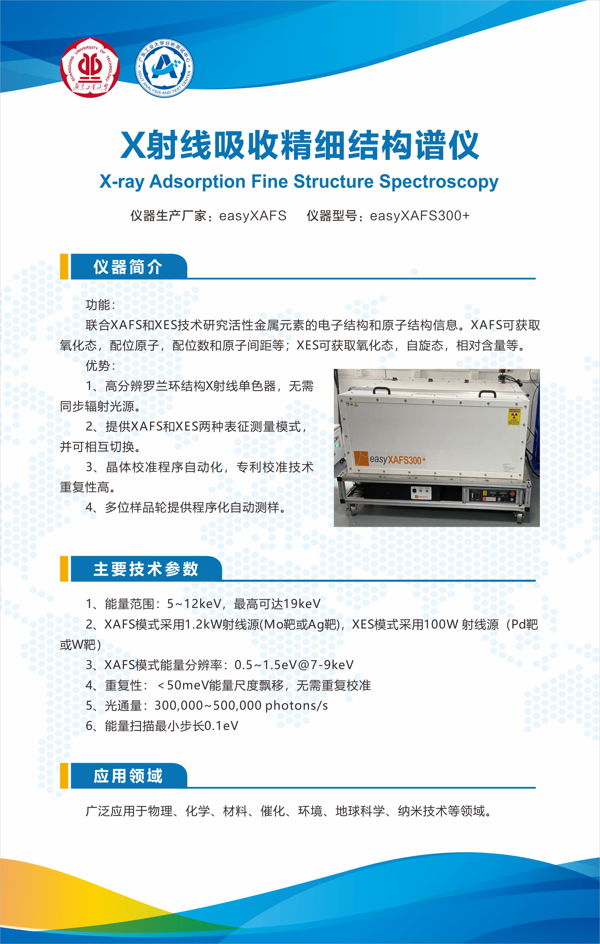 测试前请务必联系老师沟通具体信息。如样品状态、含哪些元素、密度(或浓度)、其它组分、是否要特殊保护等样品信息;是否已经做过XPS、EPR、NMR或元素分析等前期表征。