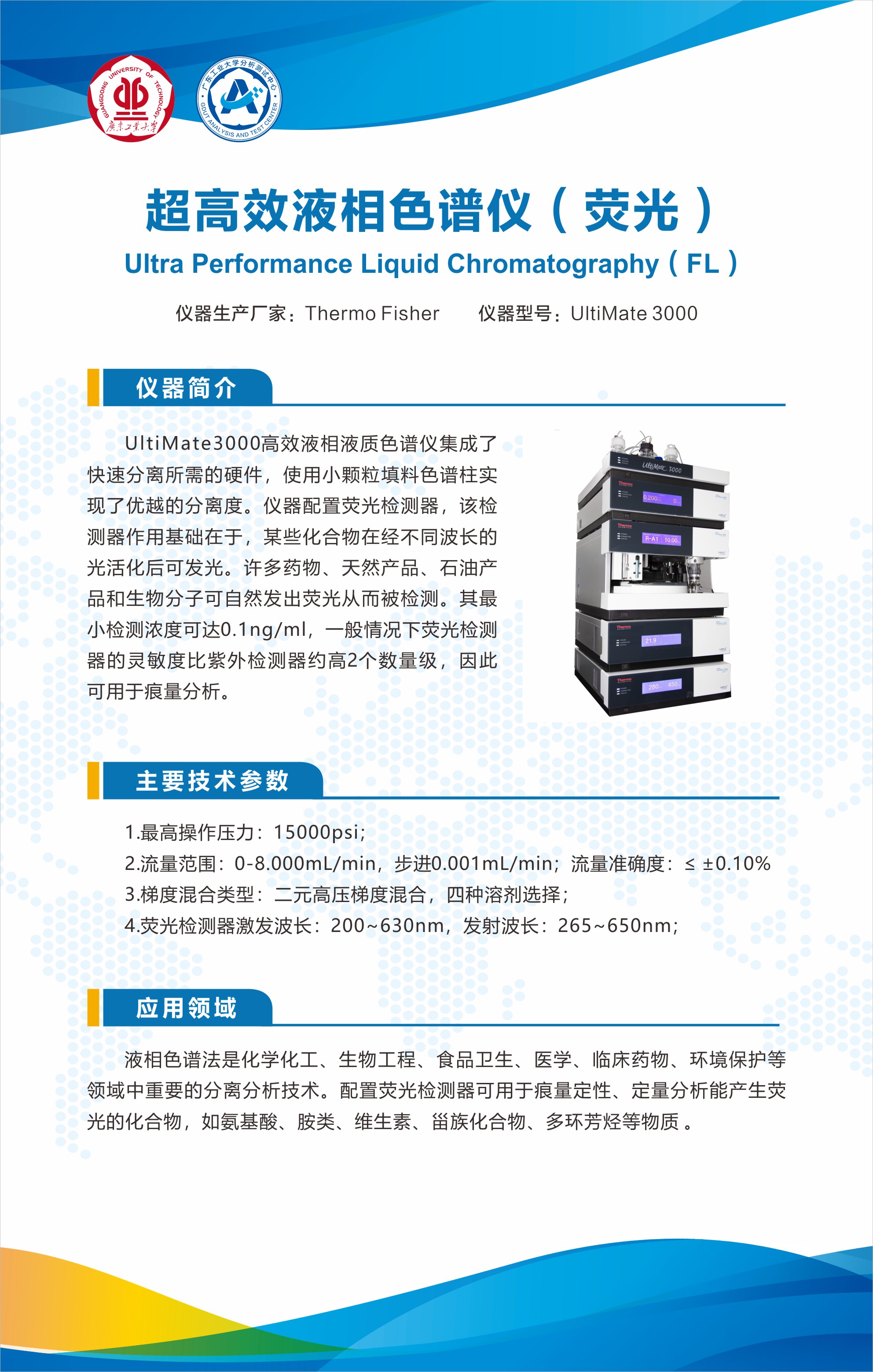 6、可测样品送样要求:固体、液体样品或样品溶液,复杂基质的样品需进行除蛋白、脂肪等净化前处理后送样;定量样品分析需提供标样;